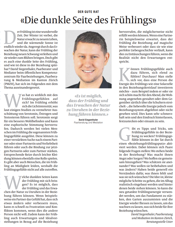 Der Winter ist vorbei, die Natur erwacht zu neuem Leben, und die wärmende Sonne ist endlich wieder da. Angeregt durch das Erwachen der Natur, kann der Frühling der Beziehung neuen Schwung verleihen und sie wieder zum Blühen bringen. Doch gibt es auch eine dunkle Seite des Frühling, und wie ist diese in der Beziehung spürbar? David Siegenthaler, Paarberater und Mediator beim öffentlichen Kompetenzzentrum für Paarbeziehungen, Paarberatung im Kanton Zürich (PMZH), hat sich im Folgenden mit dem Thema auseinandergesetzt.