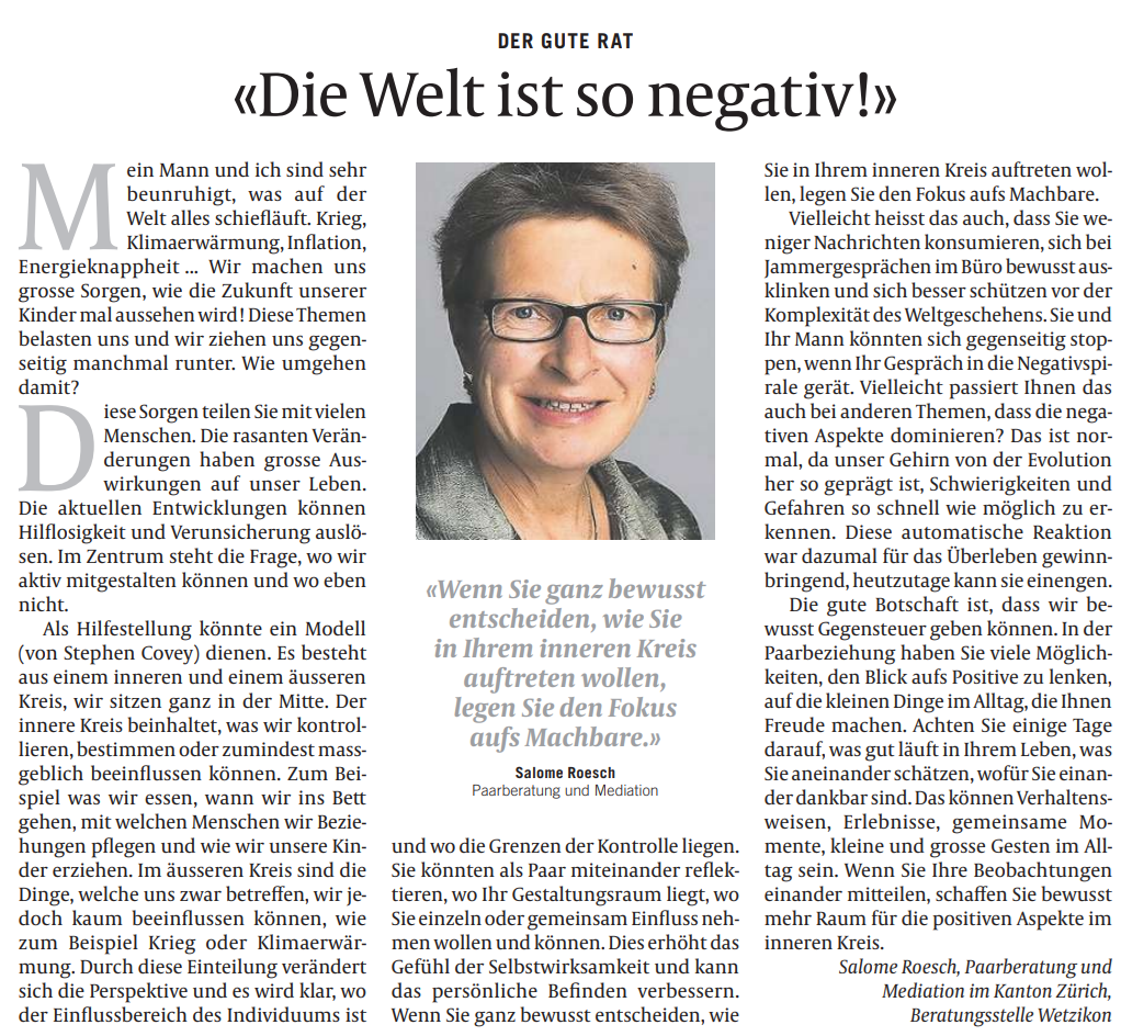 Als Hilfestellung könnte ein Modell (von Stephen Covey) dienen. Es besteht aus einem inneren und einem äusseren Kreis, wir sitzen ganz in der Mitte. Der innere Kreis beinhaltet, was wir kontrollieren, bestimmen oder zumindest massgeblich beeinflussen können. Zum Beispiel was wir essen, wann wir ins Bett gehen, mit welchen Menschen wir Beziehungen pflegen und wie wir unsere Kinder erziehen. Im äusseren Kreis sind die Dinge, welche uns zwar betreffen, wir jedoch kaum beeinflussen können, wie zum Beispiel Krieg oder Klimaerwärmung. Durch diese Einteilung verändert sich die Perspektive und es wird klar, wo der Einflussbereich des Individuums ist und wo die Grenzen der Kontrolle liegen. Sie könnten als Paar miteinander reflektieren, wo Ihr Gestaltungsraum liegt, wo Sie einzeln oder gemeinsam Einfluss nehmen wollen und können. Dies erhöht das Gefühl der Selbstwirksamkeit und kann das persönliche Befinden verbessern. Wenn Sie ganz bewusst entscheiden, wie Sie in Ihrem inneren Kreis auftreten wollen, legen Sie den Fokus aufs Machbare. Vielleicht heisst das auch, dass Sie weniger Nachrichten konsumieren, sich bei Jammergesprächen im Büro bewusst ausklinken und sich besser schützen vor der Komplexität des Weltgeschehens. Sie und Ihr Mann könnten sich gegenseitig stoppen, wenn Ihr Gespräch in die Negativspirale gerät. Vielleicht passiert Ihnen das auch bei anderen Themen, dass die negativen Aspekte dominieren? Das ist normal, da unser Gehirn von der Evolution her so geprägt ist, Schwierigkeiten und
