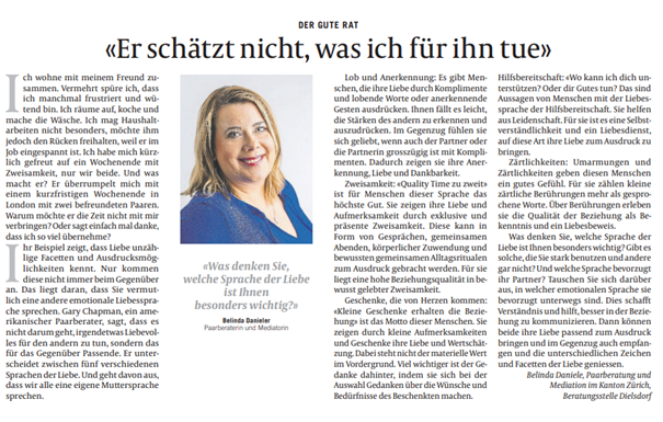 Ihr Beispiel zeigt, dass Liebe unzählige Facetten und Ausdrucksmöglichkeiten kennt. Nur kommen diese nicht immer beim Gegenüber an. Das liegt daran, dass Sie vermutlich eine andere emotionale Liebessprache sprechen. Gary Chapman, ein amerikanischer Paarberater, sagt, dass es nicht darum geht, irgendetwas Liebevolles für den andern zu tun, sondern das für das Gegenüber Passende. Er unterscheidet zwischen fünf verschiedenen Sprachen der Liebe. Und geht davon aus, dass wir alle eine eigene Muttersprache sprechen.