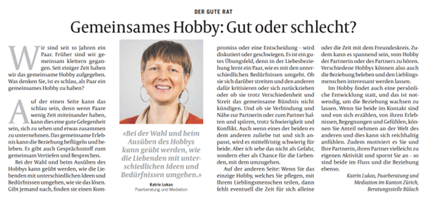 gemeinsame Erlebnis kann die Beziehung beflügeln und beleben. Es gibt auch Gesprächsstoff zum gemeinsam vertiefen und besprechen. Bei der Wahl und beim Ausüben des Hobbies kann geübt werden, wie gehen die Liebenden mit unterschiedlichen Ideen und Bedürfnissen um, wie lösen sie das. Gibt eine:r nach, finden sie einen Kompromiss oder eine Entscheidung – wird diskutiert oder geschwiegen.