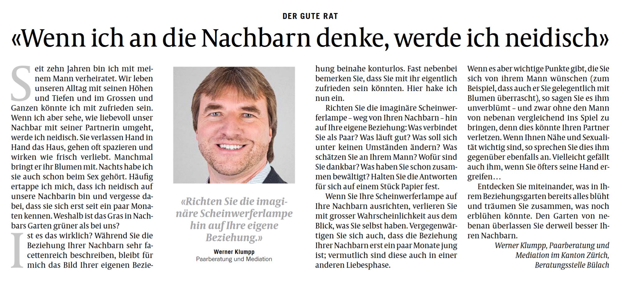 Seit gut 10 Jahren bin ich mit meinem Mann verheiratet. Wir leben unseren Alltag mit seinen Höhen und Tiefen und im Grossen und Ganzen könnte ich mit unserer Beziehung zufrieden sein. Wenn ich aber sehe, wie liebevoll unser Nachbar mit seiner Partnerin umgeht, werde ich neidisch. Sie verlassen Hand in Hand das Haus, gehen oft spazieren und wirken wie frisch verliebt. Manchmal sehe ich, wie er ihr Blumen mitbringt. Nachts habe ich sie auch schon beim Sex gehört. Häufig ertappe ich mich, dass ich neidisch auf unsere Nachbarin bin und vergesse dabei, dass sie ihren Partner erst seit ein paar Monaten kennt. Weshalb ist das `Gras in Nachbars` Garten` nur grüner als bei uns?