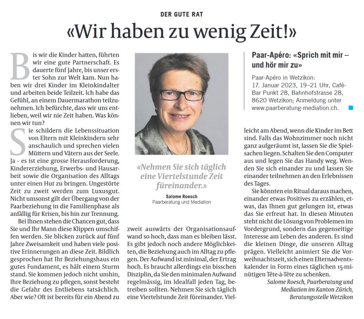 Dieser Artikel wurde im Stadt-Anzeiger Opfikon Glattbrugg unter der Rubrik «DER GUTE RAT» am 1.12.22 veröffentlicht.