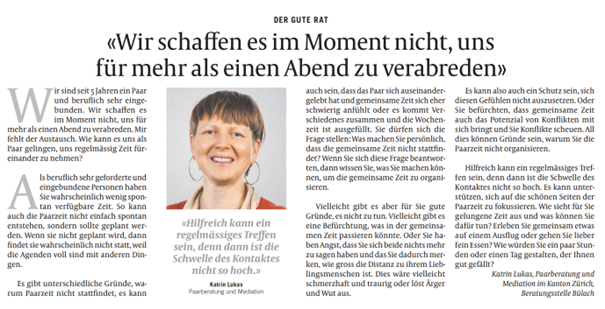 Hilfreich kann ein regelmässiges Treffen sein, denn dann ist die Schwelle des Kontaktes nicht so hoch. Es kann unterstützen, sich auf die schönen Seiten der Paarzeit zu fokussieren. Wie sieht für Sie gelungene Zeit aus und was können Sie dafür tun? Erleben Sie gemeinsam etwas auf einem Ausflug oder gehen Sie lieber fein Essen? Wie würden Sie ein paar Stunden oder einen Tag gestalten, der Ihnen gut gefällt?