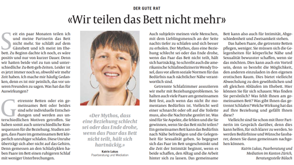 Seit ein paar Monaten teilen ich und meine Partnerin das Bett nicht mehr. Sie schläft auf dem Gästebett und ich meist im Ehebett. Zu Beginn dachte ich noch es ist positiv und nur von kurzer Dauer. Denn wir hatten beide viel zu tun und unterschiedliche zu Bett-geh-Zeiten. Leider ist es jetzt immer noch so obwohl wir mehr Zeit haben. Ich mache mir häufig Gedanken, denn es ist mir peinlich das vor unseren Freunden zu sagen. Was hat das für Auswirkungen?